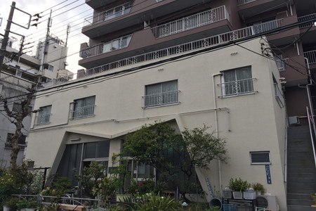 | スカイツリーを望む6号線を渡ると、にぎやかな鉢植えに飾られた三徳湯が見えます。ビル銭なのに天井が高くて気持ちがいい、薪のお湯でゆっくり温まれる銭湯です。 |